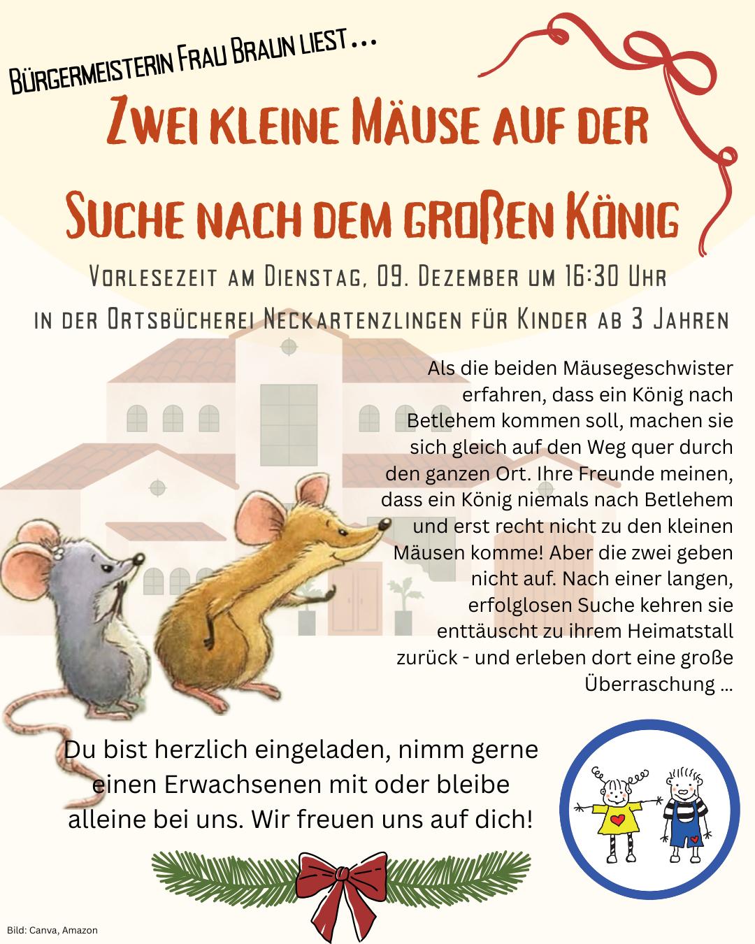 Es wird gelesen: „Zwei kleine Mäuse auf der Suche nach